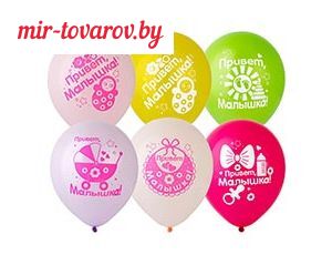 | Шары из натурального латекса. Ассорти из 6-8 цветов (в случайном соотношении).Шары с двусторонним рисунком (5 дизайнов на тему "ПРИВЕТ МАЛЫШКА"). Идеальный ассортимент для розничной продажи воздушных шариков и украшения праздника. |