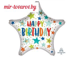 Фольгированный шар в форме большой звезды с яркой надписью Happy Birthday. Размер шара 28" (71см). При надувании рекомендуется испол ьзовать гелий. Имеет встроенный клапан - что упрощает надувание. Тонкая миларовая (фольга на полиэтиленовой основе) пленка позволяет шарам не сдуваться от недели до одного месяца. Упакован в красочный пакет, с цветным изображением шара, что позволяет выставлять товар в не надутом виде.
