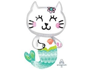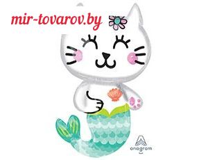 Воздушный шарик в форме сказочной кошечки-русалки. Рекомендуется наполнять гелием. Имеет встроенный клапан, что упрощает надувание. Тонкая миларовая (фольга на полиэтиленовой основе) пленка позволяет шарам не сдуваться от недели до одного месяца. Размер шара в надутом виде 18"/45см ш x 31"/78см в.