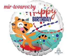 Круглый фольгированный шар с изображением милого Тигра и надписью Happy Birthday. При надувании рекомендуется использовать гелий. Имеет встроенный клапан - что упрощает надувание. Тонкая миларовая (фольга на полиэтиленовой основе) пленка позволяет шарам не сдуваться от недели до одного месяца. Товар продается в индивидуальной упаковке с цветным изображением шара.