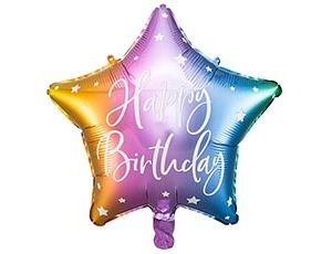 | Фольгированный шар в форме звезды, радужного цвета с белой глянцевой надписью Happy Birthday, размер до надувания ок. 47 см (18,5''), размер после надувания ок. 40 см (15,5''). Надувается гелием, так и воздухом. В верхней части шара имеются отверстия для подвешивания, при надувании воздухом. |