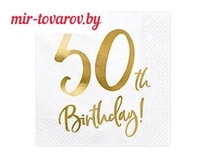 | Бумажные 3х слойные салфетки в белом цвете с фольгированной золотой надписью 50th Birthday. Размер салфетки в развернутом виде 33 см 20шт |