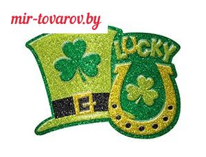 Блестящий баннер в виде шляпы Лепрекона и подковы с надписью Lucky (приносящий удачу). Вы можете закрепить его на входе в ирландский паб или в другое помещение, где собираются отпраздновать день Святого Патрика. Купить украшения для Дня Святого Патрика вы можете на нашем сайте.